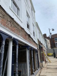 If you’ve passed through the marketplace recently, you’ll have noticed a BIG change – the scaffolding at the front of the building is now down, giving everyone a first glimpse of the transformation, and the high standard that the contractors involved are working towards. The shopfronts at No. 2 and No. 3 have now been delivered and installed, with glazing at No. 2 expected imminently. Upstairs, major improvements have also been made. Rendering and replacement window installation on the upper floors of No. 2 Market Place are now complete too, a milestone which has contributed to the building’s refreshed and historically sympathetic appearance.